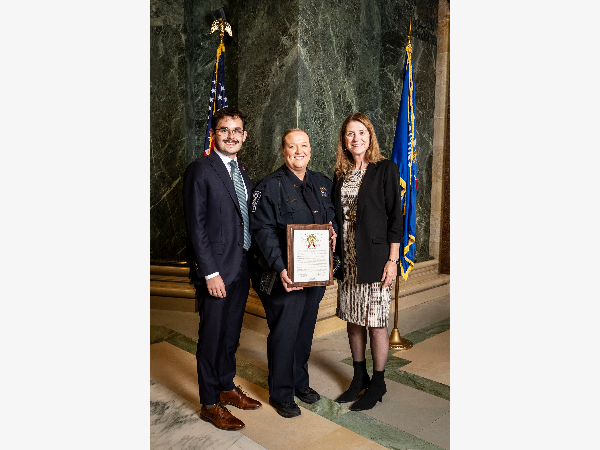 An Antigo Police Officer was recognized at the state capital for her service to the community. Earlier this week, the state Assembly presented First Responder of the Year awards to firefighters, law enforcement, and EMS who best exemplifies community service, selflessness, and dedication. State Representative Calvin Callahan presented the 35th district honor to Antigo Police Officer Julie Powell. Callahan said, "Officer Powell's dedication and commitment to keeping the people of the City of Antigo safe can't be overstated. It's easy to see the positive impact she has on others, her department, and her community." They also highlighted one particular response last June when Powell helped negotiate the safe release of two children and surrender of a suspect in a hostage situation. Powell has more than a decade of experience in Langalde County, beginning her career with the Sheriff's Department before moving to the Antigo Police Department. As we shared yesterday, Vilas County Sheriff Joe Fath was selected as the First Responder of the Year in the 34th Assembly District. In addition to to recognizing individuals, both houses of the state legislature passed a resolution declaring October 14 as First Responders Appreciation Day in Wisconsin. Photo: Rep. Calvin Callahan and Senate President Mary Felzkowski pictured with Officer Julie Powell
