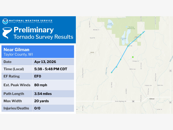 Earlier this week, we reported a tornado in northwestern Taylor County. The National Weather Service provided some additional information. The tornado touched down near Gilman Monday evening at 5:38pm. It was on the ground for about 10 minutes and traveled approximately 3.5 miles. It was approximately 20 yards width, with peak wind speeds estimated at 80 miles per hour, classified as an EF0. Officials say the tornado caused only minor damage to trees and outbuildings along its path, with no injuries or fatalities reported. Emergency management crews assisted in the damage survey. A second location near Chelsea was also investigated, bu no tornado confirmed. The tornado near Gilman was the first in the state this year, though six additional tornadoes have been confirmed in southern Wisconsin this week. It was also the first tornado ever recorded in the month of April in Taylor County.